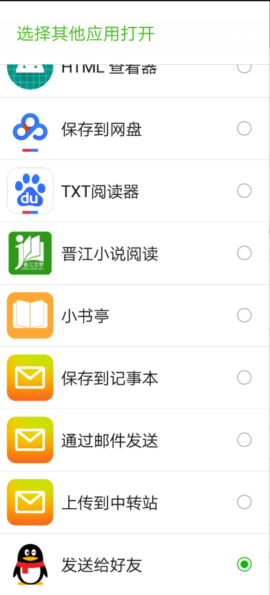 2、点击图标之后,会有几个选项,选择【用其他应用打开】,然后我们选择【发送给好友】,然后就可以发到QQ了。