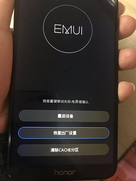 3、这时候会进入recover模式,按音量下键选择恢复出厂设置即可