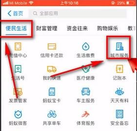 2、然后我们点击上方的【便民生活】之后我们点击【城市服务】