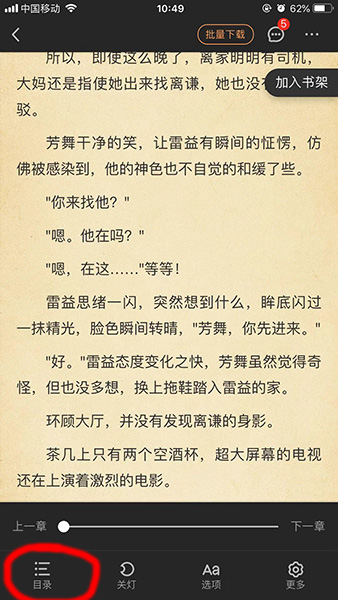 2、进入阅读小说内容的时候,点击一下屏幕,然后在左下角就可以看到目录了。