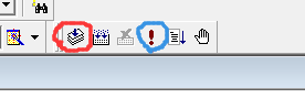 如图所示,红圈里的按钮的作用是保存cpp文件和查错,蓝圈里的像感叹号一样的按钮的作用是运行程序。