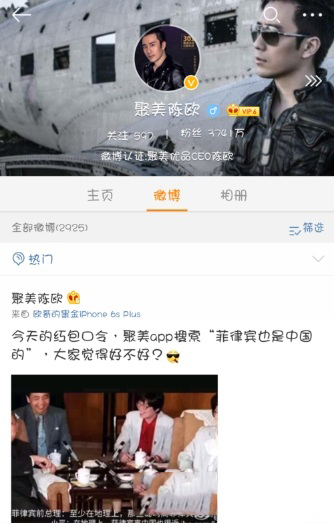 点开这个微博账号,然后手机上就会显示出陈欧的微博主页面,在他的微博中找到带有双引号的微博口令,有的时候微博中会直接告诉,有的时候只是加引号,比如最新的这个口令“菲律宾也是中国的”,记住这个口令。