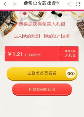 红包已经到手了,哈哈,很开心吧,那么我们领到的钱到了哪里呢?在聚美里最下面一行找到“我的”并点开,看到那个聚美余额了吗,钱就在那里呢,等钱攒多了,你可以提现,也可以用来在聚美上买东西哦!