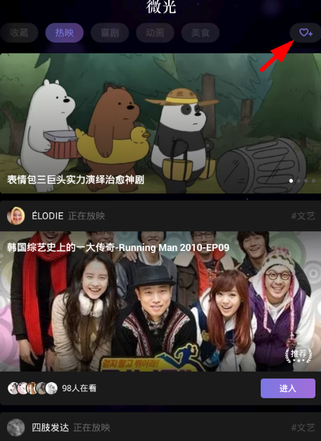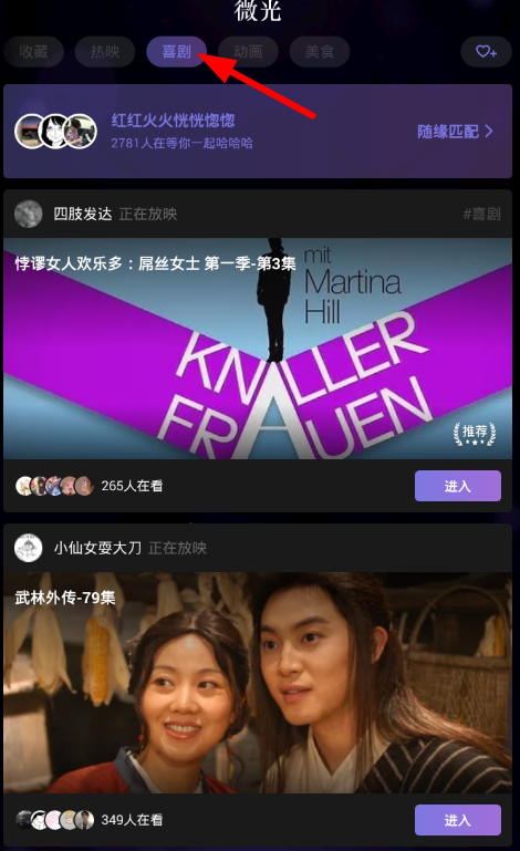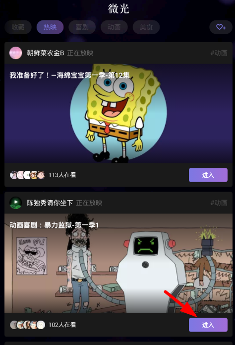 1、用户若是想要在微光里邀请好友一起观看视频的话,就应该先点击“进入”选项,在自己感兴趣的的视频放映厅中,开始邀请好友。
