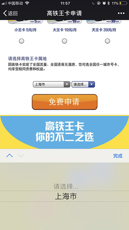 大家可以根据自己的需求,看看自己适合办那一种高铁王卡,最实惠的肯定是39元的天王卡了。选择好高铁王卡之后选择城市,然后直接点击“免费申请”。