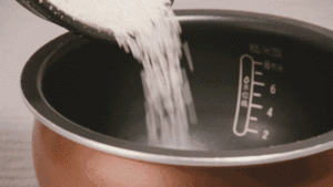 洗好的大米倒入锅中,切好的蔬菜粒和香肠摆好位置
