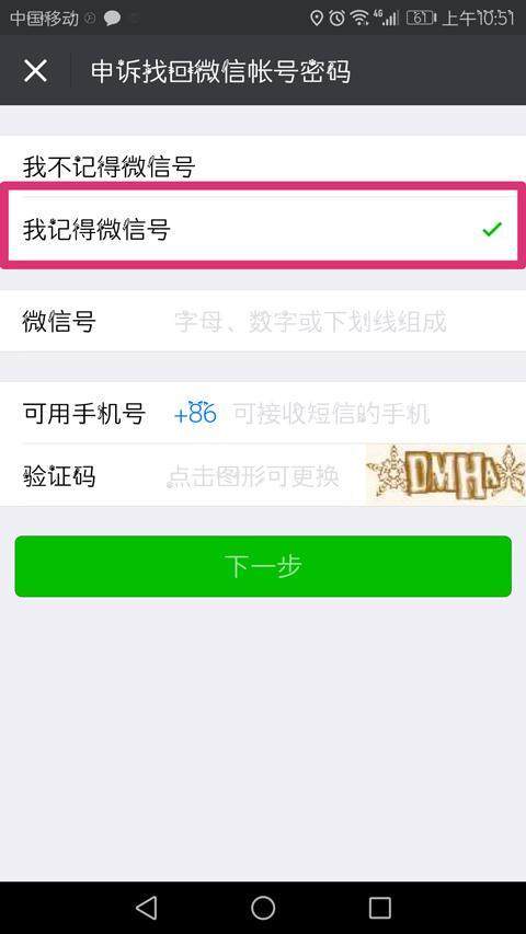 7、选择“我记得微信号”,填写微信号号,并填写一个可用手机号。