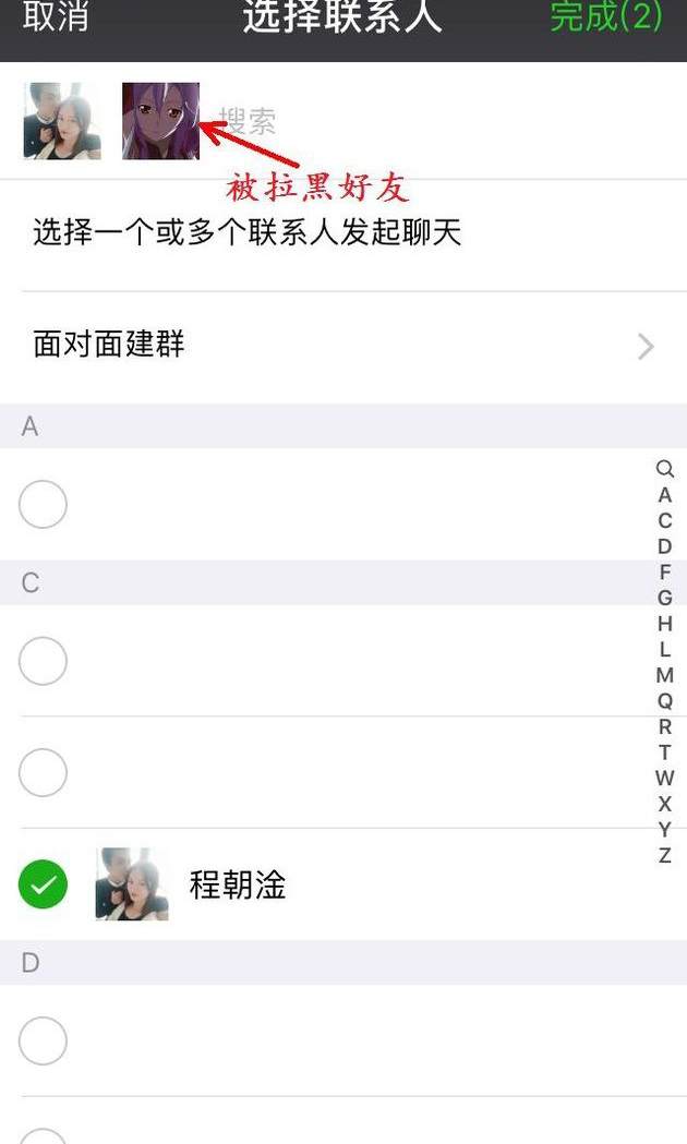 3、在好友的界面选择一个可以给我们提供帮忙的好友,再选择被拉黑的好友一起拉入群聊,最后再点击“完成”按钮。