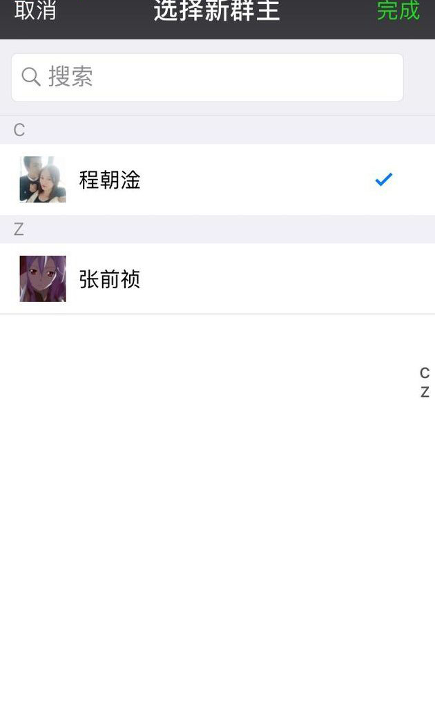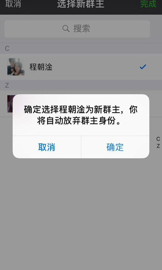 7、在选择新群主的界面,把它转让给帮忙的好友,然后再点击“完成”按钮。