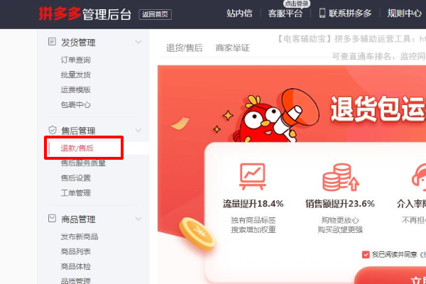 1、点击打开拼多多网站,点击登录。点击右侧的“退款/售后”。