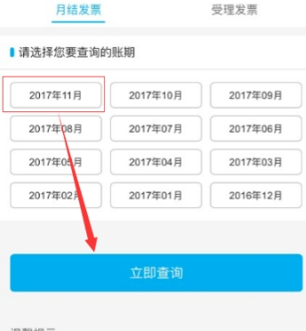 2.在“电子发票”中可以看到两项,月结发票和受理发票,这里报销的话当然是需要打印月结发票,选择需要打印的月份,点击“立即查询”。
