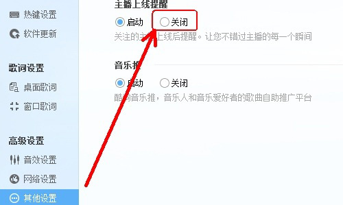 这里点击其他设置,看到主播上线提醒,点击关闭。