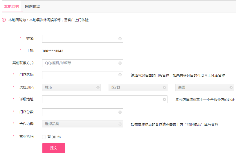 6.进入“商家合作”后填写好“本地团购”与“网购物流”的相应信息后点击提交,如图6所示