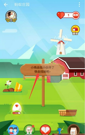 单击之后就会进入到自己的蚂蚁庄园,此时会提示我们“小鸡去找小伙伴了快去找她吧”,我们单击该条提示按钮。