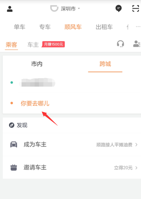 3.接着回到顺风车跨城界面,再点击“你要去哪儿”进行终点的设置。