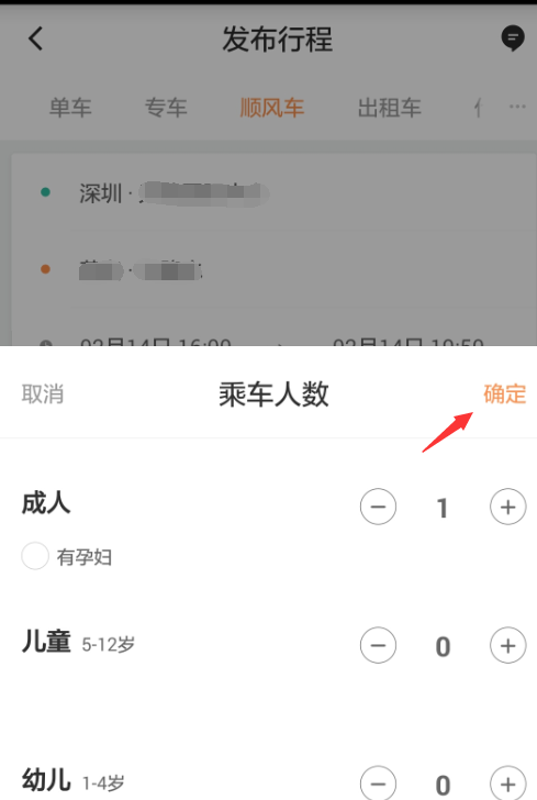 5.出发时间设置完成后,会来到乘车人数的设置步骤,可以根据实际乘车的人数进行设置即可。