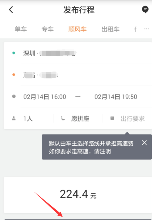 6.设置完成之后,滴滴会根据出行的距离、人数和出行要求等情况,预估出一个大概的费用,如果可以接受这个费用的话,就点击“确认发布”按钮。