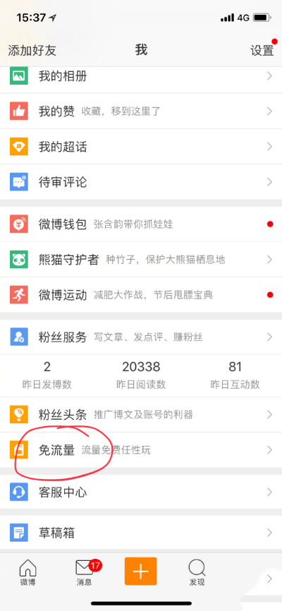 打开微博首页,找到免流量选项;