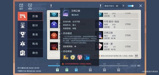 二、当开启日常任务时优先做日常任务,比如每天的“王牌之旅”(主线做在19级时会作为主线教程)可以在右边的任务栏或者顶部的活动页面找到。王牌之旅的经验多,进度快,仅需几分钟时间就可以刷完,还有其他奖励。其他的日常可以在活动页面找到,有时间的可以打跨服战场—自由一日,经验丰富,但是时间较其他的活动长,大致需要10分钟,错过日常的没关系,可以在活动的补课界面找回经验(金币能找回70%,大概需要1万左右金币,钻石能找回90%,大概需要100钻石)