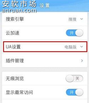 4在设置界面,找到“UA(浏览器标识)设置”并点击以选择其他选项,在列表项中将浏览器UA设置为“电脑版”。