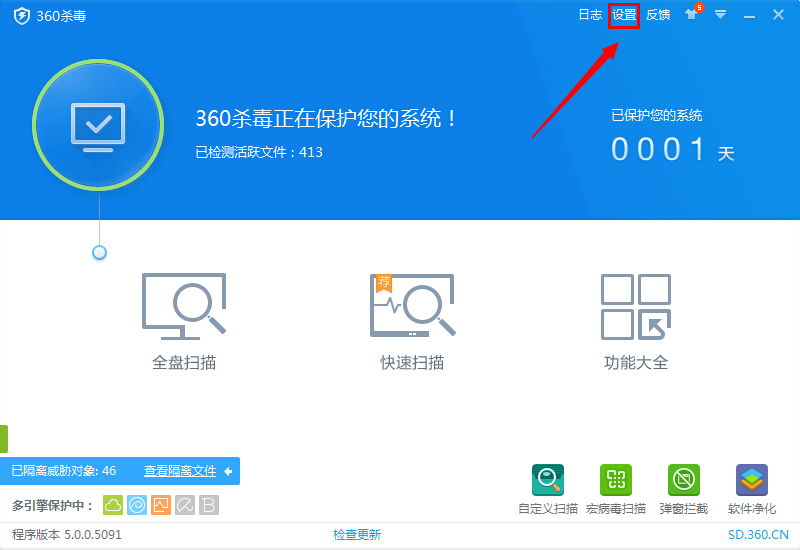 1.打开360杀毒软件,在右上角点击‘设置’。