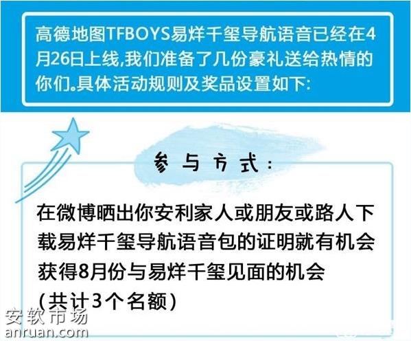 1、首先,下载游戏爱好者最新版的高德地图,在微博上晒出你安利家人或者朋友下载易烊千玺语音包的证明就有机会获得8月份与易烊千玺见面的机会,共3名额,官方图如下: