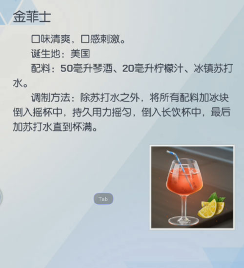 配方:50毫升琴酒、20毫升柠檬汁、冰镇苏打水。