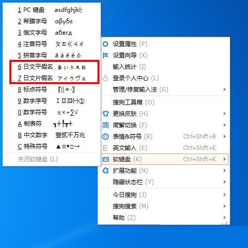 1、右击搜狗输入法,点击软键盘,在软件盘选项中有“日文平假名”和“日文片假名”;