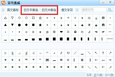 2、在符号集成中选择有“日文平假名”和“日文片假名”。