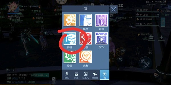 点击展开聊天框,通过下方的分栏选项点击我即可进入到个人的关系查看页面,其中就有一项师徒。