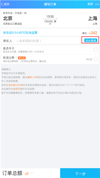 选择“添加乘客”填写手机号等相关信息并按需要选择其他选项,选择下一步