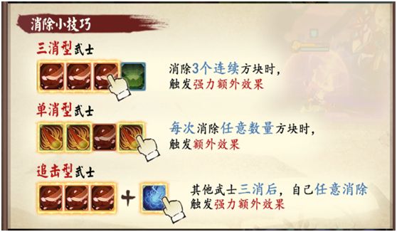 武士根据消除方式可以分为:三消型、单消型、追击型。