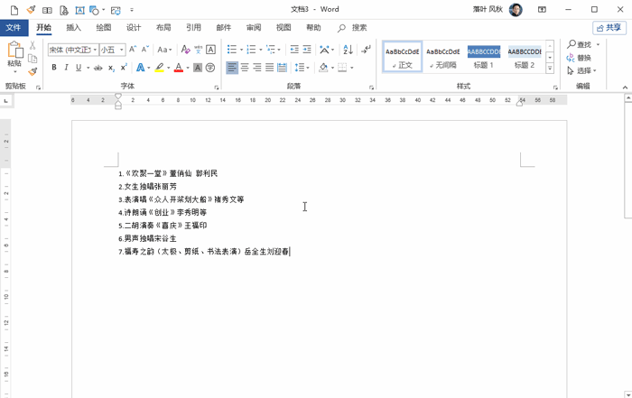 制作节目单时,常常需要将序号、节目、演出者对齐显示。这样的要求对于传统方法来说是很麻烦的,而且也不容易对得很齐。其实利用制表位功能,我们只要全选所有文字,在标尺上点击每个间隔点位置,然后将光标定位到需要间隔的位置按下TAB键,轻轻松松便实现了所有句子的对齐