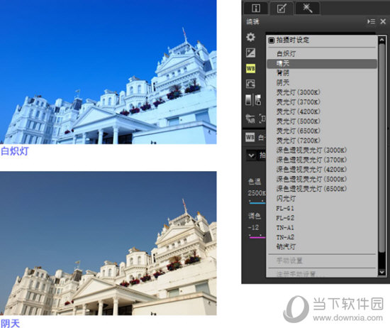 3、当然你也可以使用图像调整板块中的色温和调色控制微调白平衡,;选择较低值可使绿色更淡而洋红色更浓,选择较高值则获得相反效果。色温可用值的范围根据白平衡中所选项的不同而异,如下图所示: