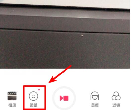 1、进入拍摄页面,然后点击【贴纸】;