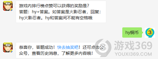 游戏内排行榜点赞可以获得的奖励是?答题:hy+答案,10月28日火影忍者手游每日一题的答案是什么?不知道的学员们,进来看看正确答案吧!回答正确即可领取豚豚为大家准备的丰厚奖励了