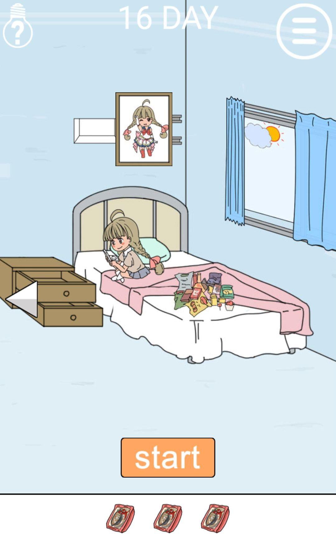 点击罐子,然后获得游戏机,然后把游戏机给妹妹。然后点击被子获得火锅底料,然后画像后获得火锅底料,还有抽屉里。然后把全部的火锅底料放在一场景的桌子上。点击开始,过关