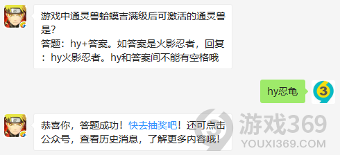 游戏中通灵兽蛤蟆吉满级后可激活的通灵兽是?答题:hy+答案,11月4日火影忍者手游每日一题的答案是什么?不知道的学员们,进来看看正确答案吧!回答正确即可领取豚豚为大家准备的丰厚奖励了