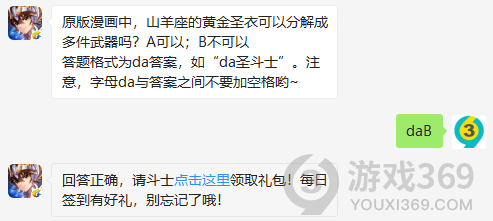 原版漫画中,山羊座的黄金圣衣可以分解成多件武器吗?答题格式为da答案,11月8日圣斗士星矢每日一题的答案是什么?不知道的斗士们,进来看看正确答案吧!回答正确即可领取雅典娜为大家准备的丰厚奖励了