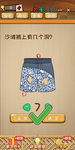 随着我们的逐步深入,已经来到了神脑洞的第31关,游戏的难度也开始加大了,玩家需要找出图中裤衩的洞数量,看起来很简单,其实暗藏玄机。