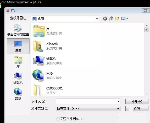 上传文件。执行rz命令上传文件,弹出文件选择窗口。