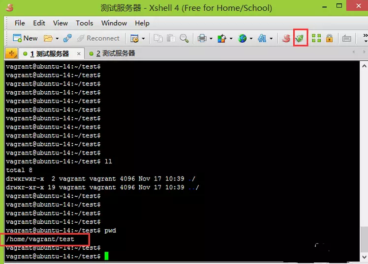 首先打开Xshell软件,连接上Linux服务器,cd命令切换到一个指定的目录。为演示Xftp关联的效果,这儿切换到一个测试目录。然后点击如图所示的Xftp绿色的按钮即可打开软件。