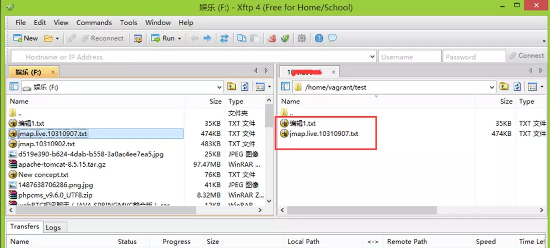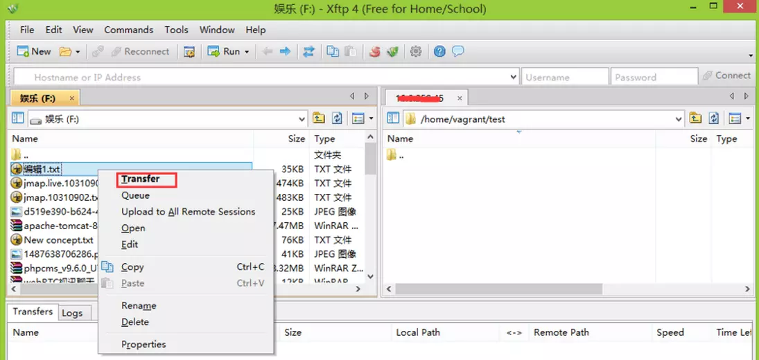 如图所示,切换到需上传下载的本地目录之后,右击选择Transfer,即可将文件上传到服务器上。双击文件可以上传文件。