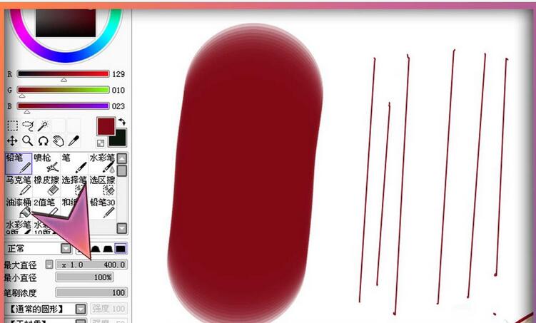 笔刷大小通过最大直径来调节。最大直径较小时,就和我们平时用的笔一样,可以画出一根一根的线条。