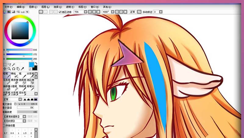 接下来是笔刷浓度,笔刷浓度这里举例说明,小编现在用百分之百笔刷浓度的铅笔为黄色的头发铺一个蓝色,可以发现,黄色的头发被完全覆盖。