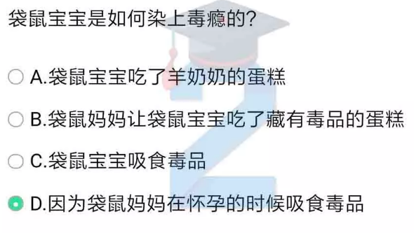 答案:D、因为袋鼠妈妈在怀孕的时候吸食毒品。