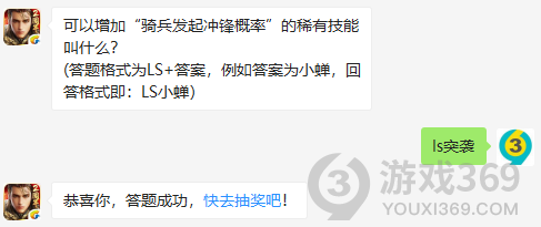可以增加骑兵发起冲锋概率的稀有技能叫什么?答题格式为LS+答案,11月17日乱世王者每日一题的答案是什么?不知道的主公们,进来看看正确答案吧!回答正确即可领取小婵为大家准备的丰厚奖励了