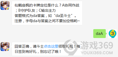 仙鹤座枫的卡牌定位是什么?答题格式为da答案,11月17日圣斗士星矢每日一题的答案是什么?不知道的斗士们,进来看看正确答案吧!回答正确即可领取雅典娜为大家准备的丰厚奖励了