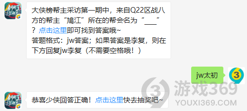 大侠榜帮主采访第一期中,来自Q22区战八方的帮主鳩江所在的帮会名为?答题格式:jw答案,11月20日剑网3指尖江湖每日一题的答案是什么?不知道的少侠们,进来看看正确答案吧!回答正确即可领取3妹为大家准备的丰厚奖励了