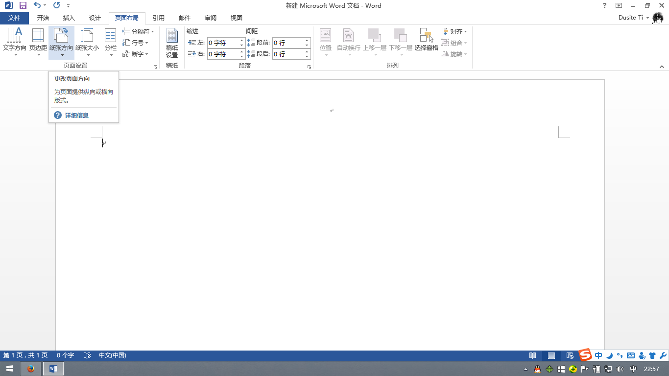 首先打开word2013,在功能区的页面布局中单击纸张方向。